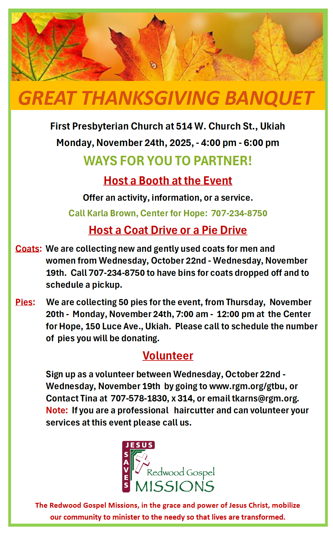 In partnership with Ukiah Churches, Redwood Gospel Mission Ukiah’s Great Thanksgiving Banquet will be hosted at the First Presbyterian Church. We will have a warm Thanksgiving meal for everyone to enjoy, haircuts, activities, community resources, coat distribution and a chapel service with a gospel message.